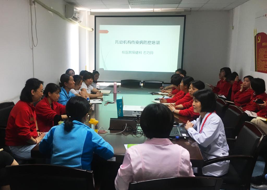 2018年4月20日,北航校医院儿童保健科石巧玲主任一行三名医生来到北航幼儿园,分批对教师们进行了幼儿春夏季传染性疾病的培训。我园后勤副园长陈洁,保健室主任陈永霞以及全体保健医生一同参加此次培训。培训中老师们认真聆听、记录,为防护春夏季传染病做准备。