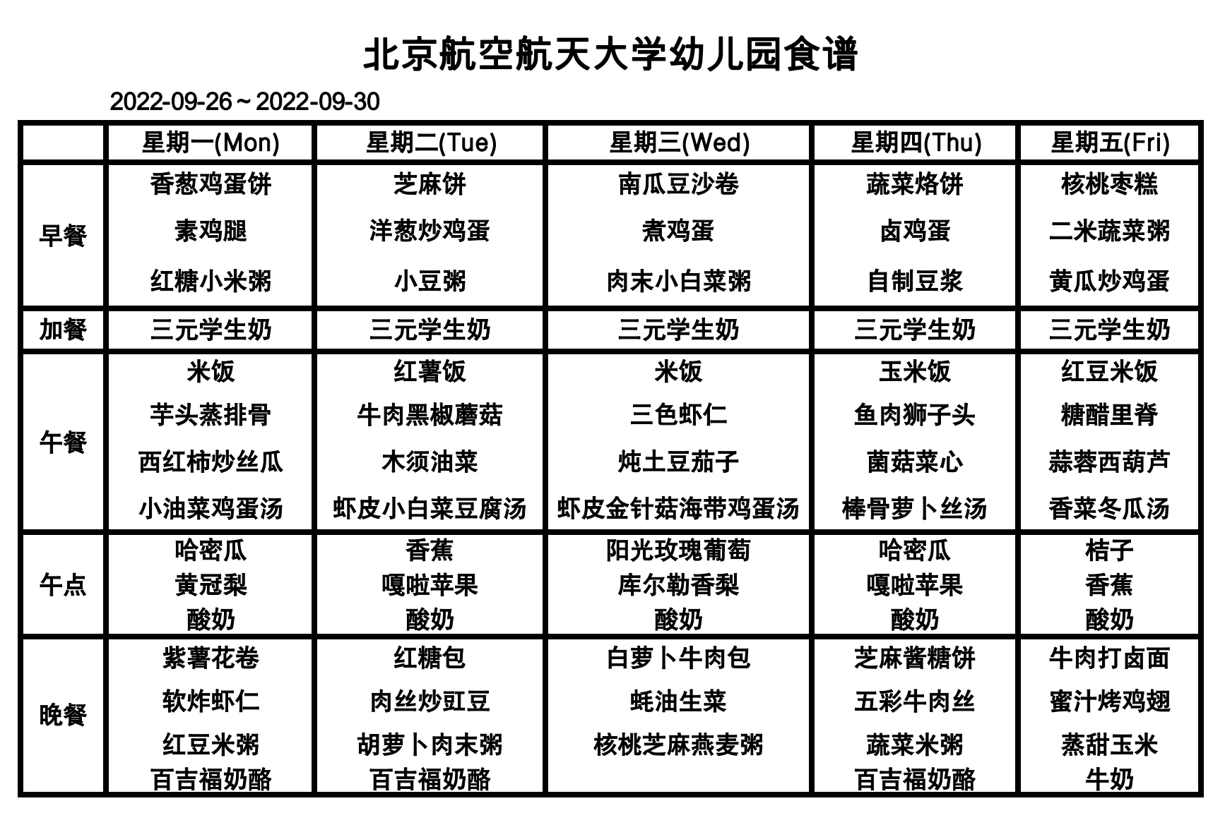 北航幼儿园2022年幼儿食谱(9月26日-9月30日)