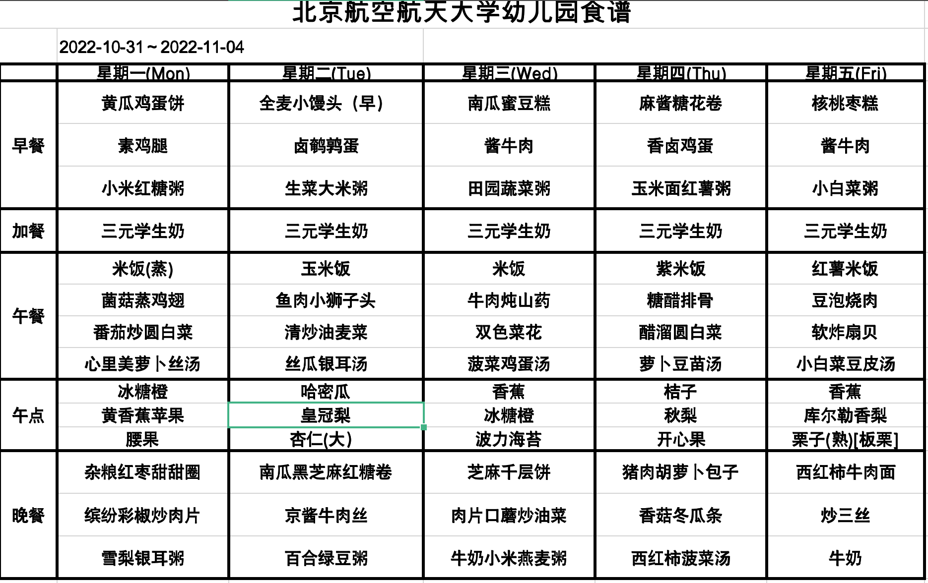 北航幼儿园幼儿食谱(2022年10月31日-11月4日)