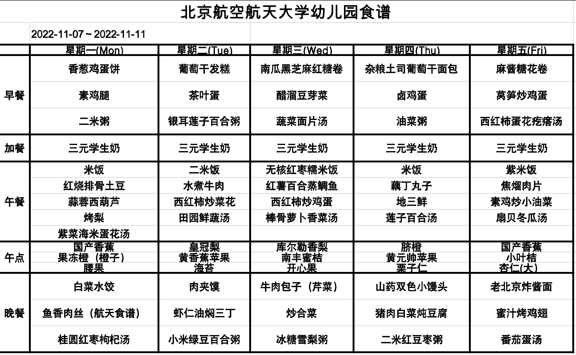 北航幼儿园幼儿食谱(2022年11月7日至11月11日)
