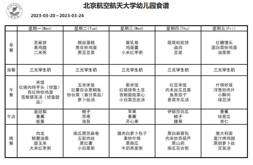 北航幼儿园幼儿食谱(2023年3月20日-3月24日)