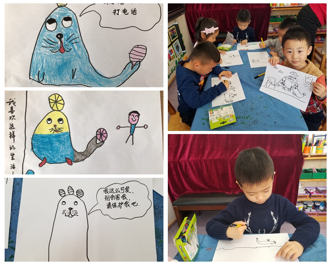 孩子的画面中,水是那样的湛蓝、阳光是如此的璀璨,孩子们眼中的海豹一个个憨态可掬,顶石子、玩小球、打电话......想到可爱的海豹,孩子们的脸上就洋溢起灿烂的笑容。愿我们交给孩子们手上的世界,能够永远承载这份灿烂。