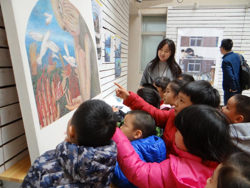 2018年3月21日与23日,本学期北航幼儿园特色"星空课程"再次启航,艺术小组的五个班级分批来到北航新媒体艺术与设计学院"启航艺术空间"参观研究生《装饰绘画》课程汇报展。并由新媒体艺术与设计学院2017级党支部的研究生志愿者们为幼儿做讲解指导。"什么叫设计?""这个楼上什么也没画,怎么在画里,这个地方却画着一个好大的巨人?""这就叫设计,是哥哥姐姐们的想象"……就这样参观在孩子半知半解的疑问和志愿者哥哥姐姐们的应答中开始了......