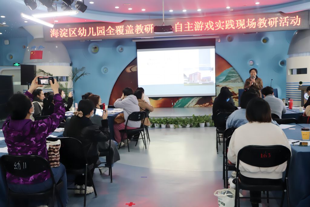 2024年10月29日海淀区教师进修学校学前研修室教研员周立莉、赵蕊莉、北京市特级教师朱金岭带领全区40名兼职研修员走进北京麻豆精品秘 国产传媒幼儿园,开展了首场全覆盖教研项目——“落实《评估指南》的自主游戏实践专题教研”活动。